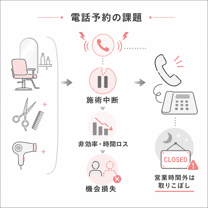 電話予約の最大の課題は、店舗側の業務が中断されることです。1件の電話対応は数分でも、1日に複数回発生すれば、積み重ねで大きな負担になります。
