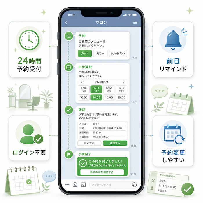 最近では、LINEを起点とした予約体験をよりスムーズにする仕組みも広がっています。たとえばLINEミニアプリ連携のように、お客様が普段使っているLINEの中で違和感なく予約や来店体験を進められる設計は、今後さらに重視される可能性があります。