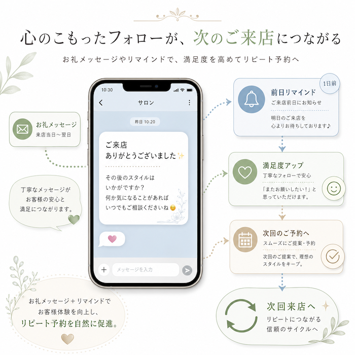 特に新規開業サロンでは、「一度来店して終わり」を減らし、再来へつなげる導線づくりが重要です。その意味でも、LINEは単なる予約窓口ではなく、関係構築の起点になり得ます。